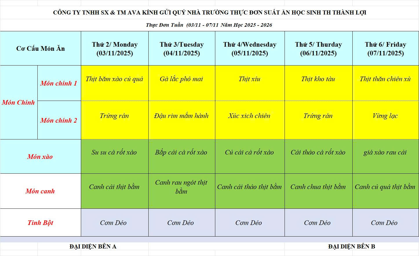 Thực đơn ăn bán trú tuần 1 tháng 11/2025