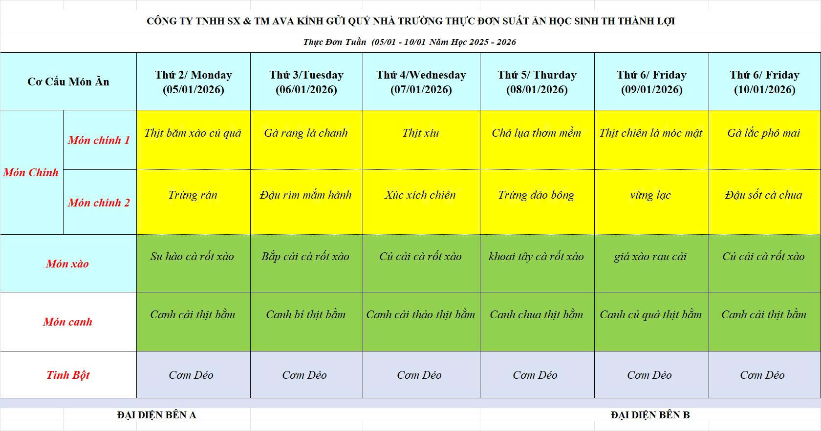 Thực đơn ăn bán trú tuần 1 tháng 2/2026