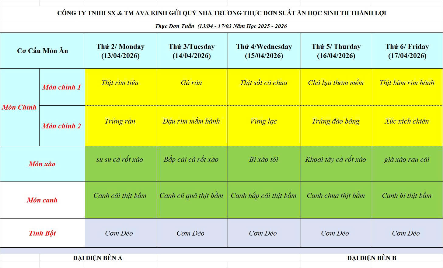 Thực đơn ăn bán trú từ 06/04/2026 đến 10/04/2026